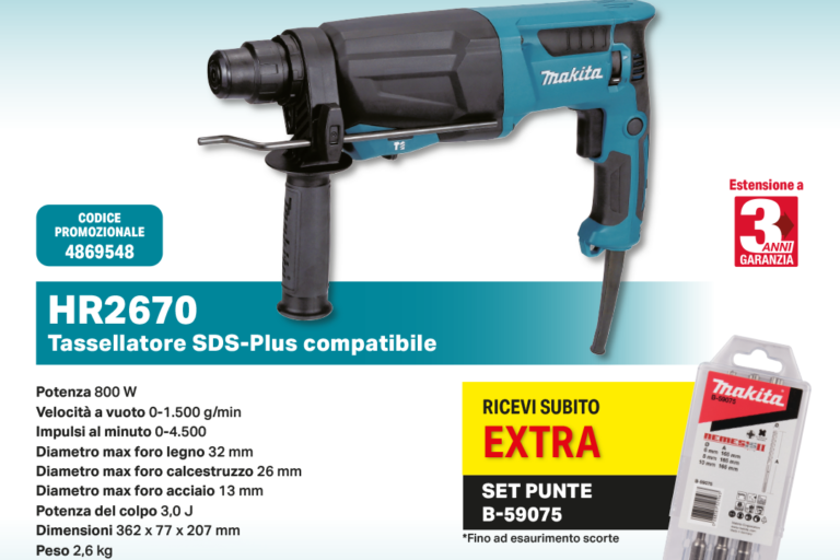 Da Centroedile trovi in promozione il tassellatore Makita HR2670, compatibile SDS-Plus: uno strumento professionale, preciso e versatile, pensato per chi lavora ogni giorno in cantiere.